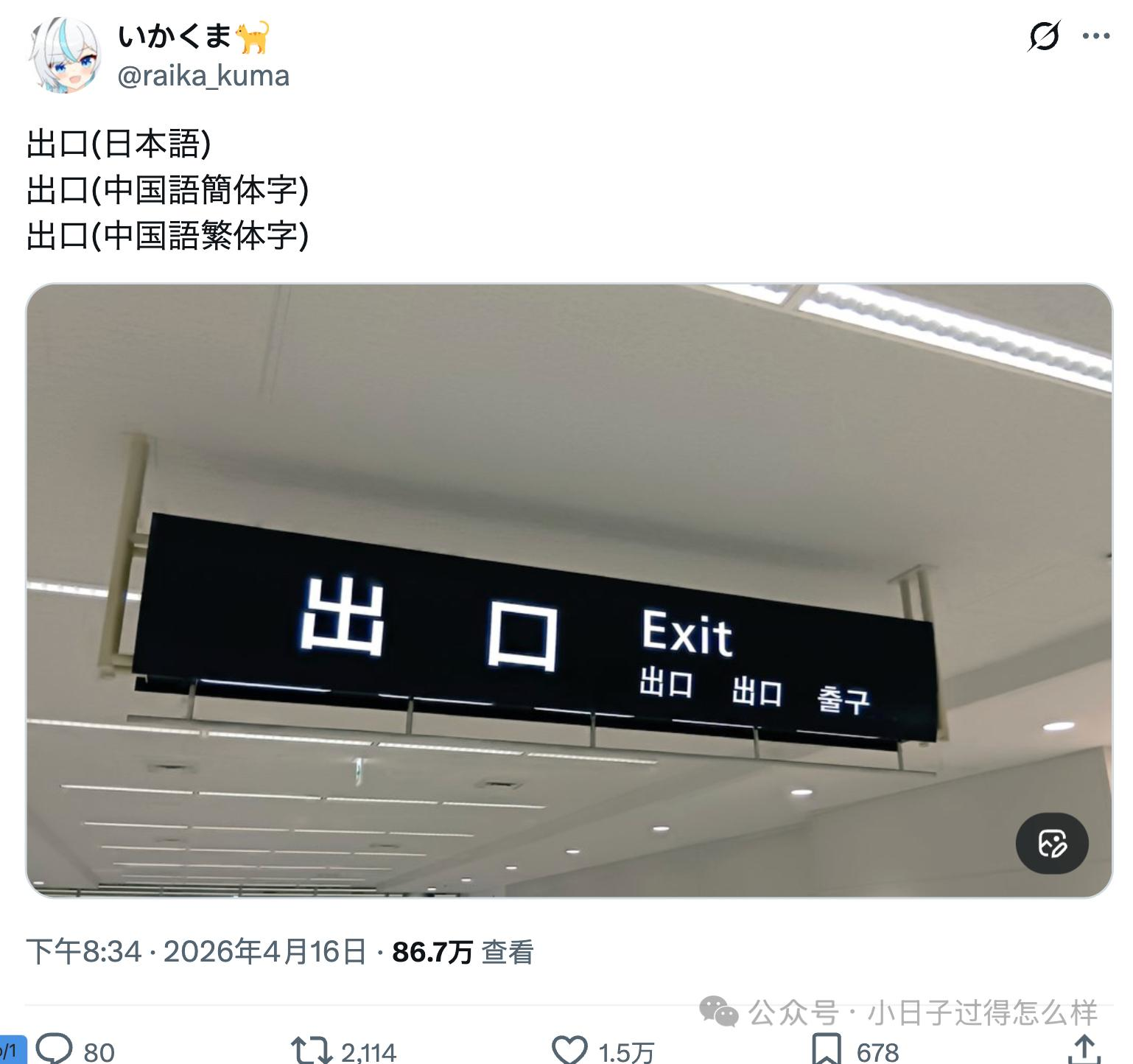 日本人就是轴,如图一,大字号的“出口”是日文,小字号的两个“出口”一个是繁体中文,一个是简体中文